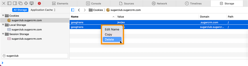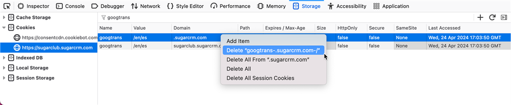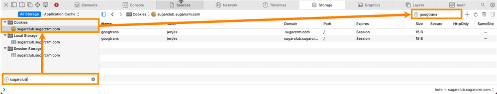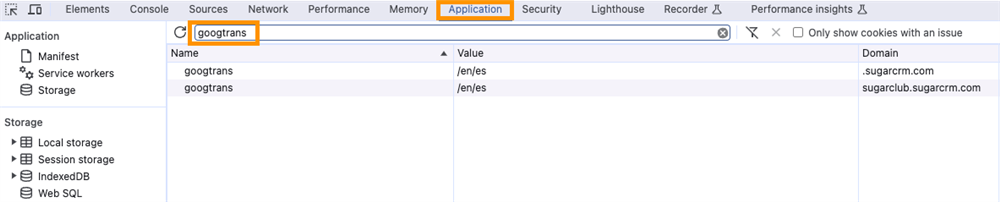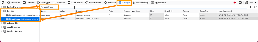 - Under the "Storage" menu, locate the "sugarclub.sugarcrm.com" under "Cookies" and filter to "googtrans"