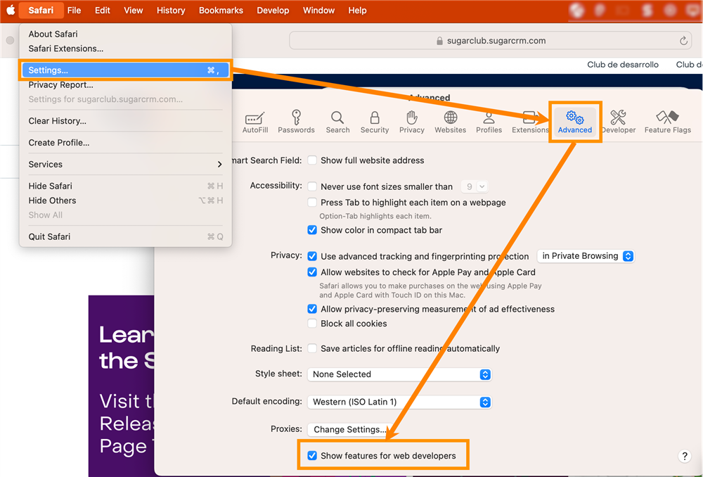 - Go to Safari > Settings > Advanced and check the box for "Show features for web developers" and then you can close the settings window