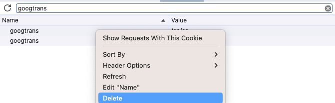 - Under the "Storage" menu, filter the sidebar to "SugarClub," select "Cookies," and filter your cookies to "googtrans"