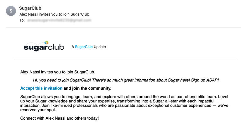 Do you have a colleague who would benefit by being a SugarClub member? Maybe this is a new employee at your organization, or simply someone you want to make sure is as involved and informed as you are about SugarCRM. Instead of just telling them, you can send them an invitation through this form:
