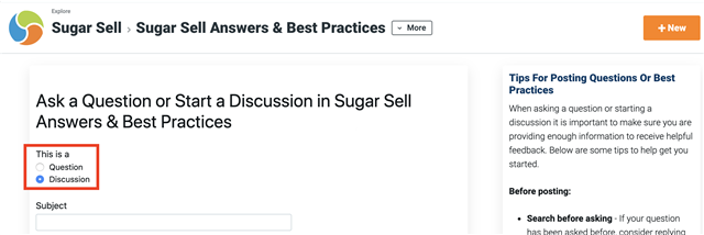 In the last month, Club members who have product-specific tips and tricks to share have been asking where and how to share these important pieces of information. Explore groups are dedicated to each Sugar product, but the existing ways to create posts (either Questions or Ideas) didn't really work for sharing. I'm excited to announce that these groups all now contain an option to "start a discussion", allowing creators to create posts to share their Sugar wisdom. The big difference with a discussion versus a question is that replies will not have the "answer" options, so creators can proactively help instead of asking for help.
