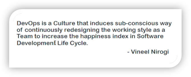 How did they do that? Vineel took over and talked about how DevOps changed Everything. Since the definition of DevOps differs from everyone, Vineel defined DevOps as a Culture that induces sub-conscious way of continuously redesigning the working style as a Team to increase the happiness index in Software Development Cycle. He further explained that DevOps is influenced by 4 areas. These 4 areas comprise of: