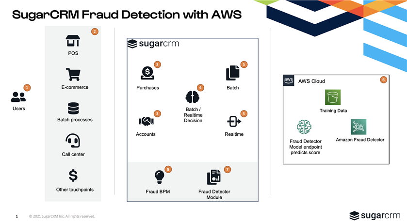 A customer (1) would like to make a purchase in our e-commerce app (2) that backfeeds data to Sugar Sell. At customer sign-up, we check in Sugar if that account already exists. If not, we create will create the account (3) in Sugar which triggers an AWS fraud detection process (4,5,6) that assesses the risks. If the account is flagged as fraudulent, then the e-comm system will not allow checkouts for this new account.