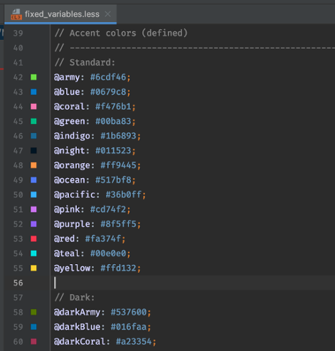 To add a custom color variable to your theme, locate the ~/styleguide/less/fixed_variables.less file. The color variables already defined in Sugar start near line 42.