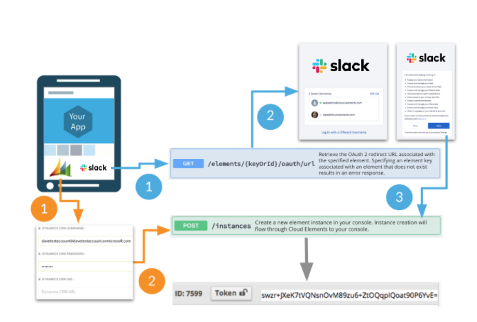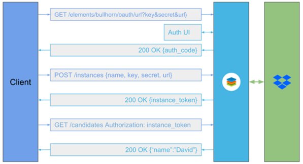 GET /elements/{keyOrId}/oauth/url- which passes in the Client ID, Client Secret, and Callback URL (obtained from the registered app - see above). - User authenticates via the UI provided by the endpoint's authorization server. Once authenticated, the authorization code is returned.