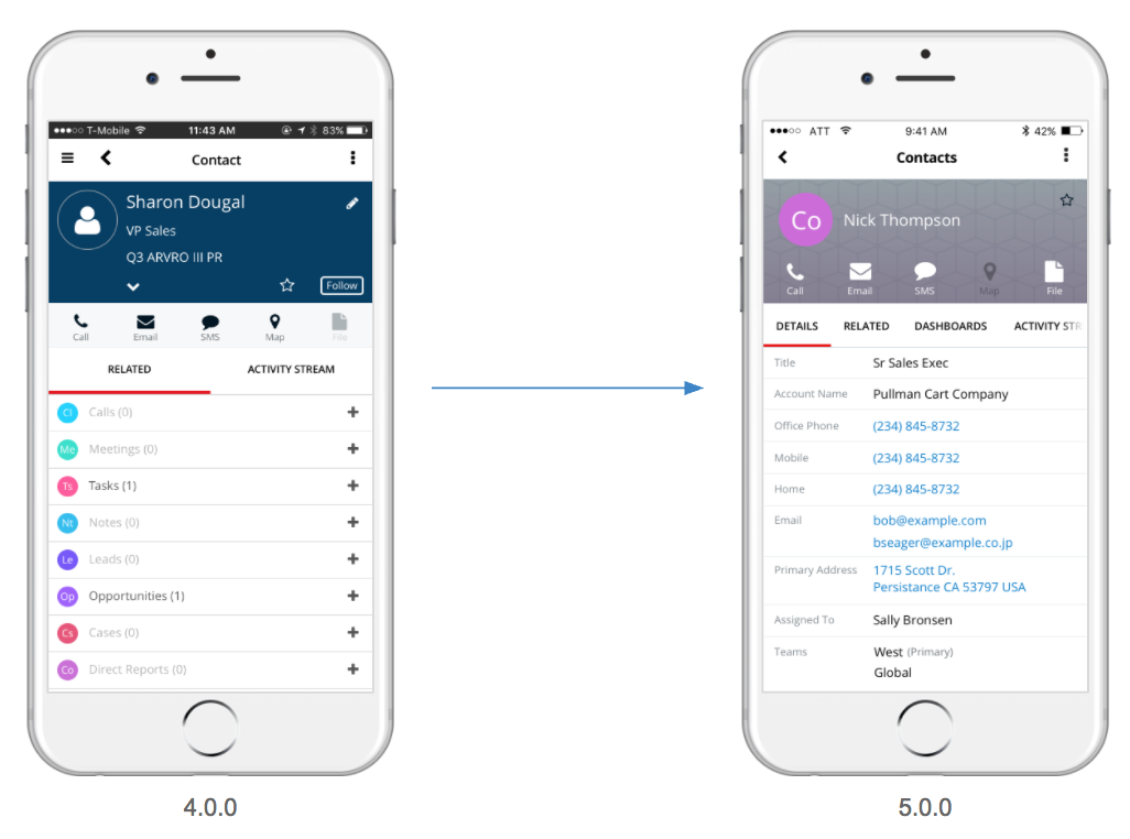 As part of the SugarCRM Mobile 5.0.0 release, we introduced a redesigned user experience. We reduced the number of clicks needed to reach information, for example, by redesigning the record details view to show more information on the initial screen in a Details tab. We also improved navigation and re-ordered tabs and elements in the user interface based upon customer feedback.