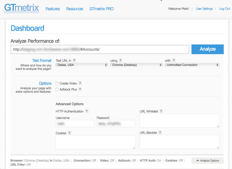 Setting up the test in GTMetrix is straightforward but a little more complex than testing a simple web page that is accessible by the public. The first step is to click the small gray "Analysis Options" button, just underneath the larger blue "Analyze" button on the right hand side.