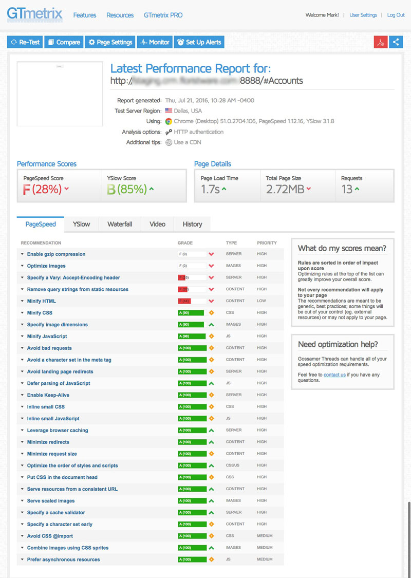 For this test it is also essential that you enter a valid username and password so that GTMetrix can log into the account.