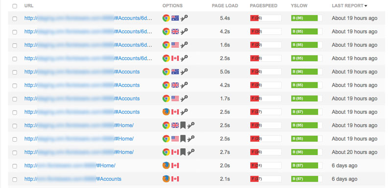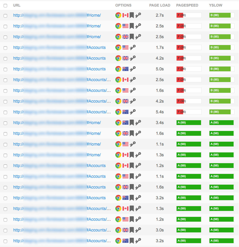 Now the interesting part – we looked to see what (if any) performance gains we had accomplished. We did all the same tests again in GTMetrix and compared the results. The old test, before CloudFlare, appear at the top of the list and the newer results appear at the bottom.