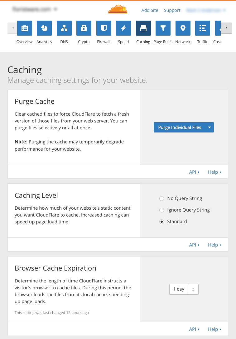 Next up are the caching settings (choose "Caching" from the icons arranged across the top of the CloudFlare dashboard...