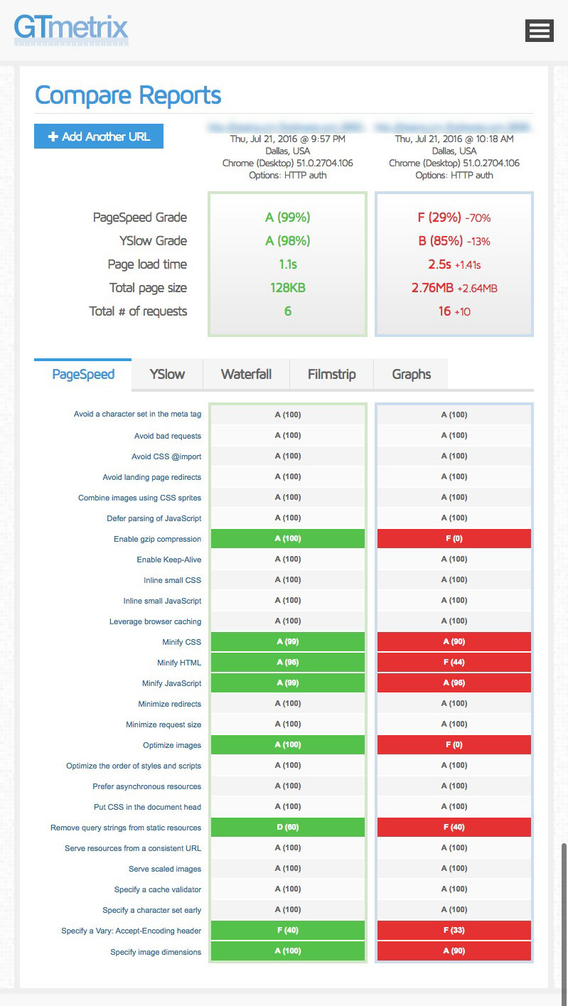 It is also worth using a great feature in GTMetrix that lets you compare two or more reports. Here it is used to compare the before and after performance of the Sugar home page from Dallas TX. This is likely the most relevant test in our case – most users are in the US and this is the first page they load each day.