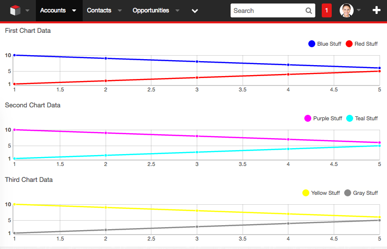 Previously we explored how to display a single chart on a view. Displaying more than a single chart on the view is also very easy too.In order to add a second chart, you may be tempted to create another chart object in the initialize() method but that is not necessarily how Sugar Charts works. The "chart" property in the view controller is a Chart factory. Chart factories will not affect how your view is rendered unless you do something with them. You can use the same factory's call() method to construct the same style of chart multiple times.