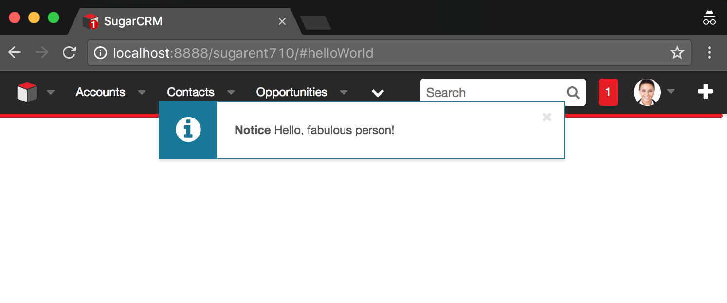 Now we're ready to test. Navigate to http://yourSugarInstance/#helloWorld. Unless you missed a step, the alert you created will appear!Note: you may need to refresh the page once to pull in the updated JavaScript in order for the alert to appear. It's a good idea to disable your browser cache when doing JavaScript development too.