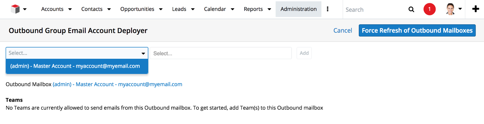 Opening the deployer will take you to a new page where you have several dropdown lists for selecting the applicable email account, the team to which you want to deploy the email account, and a list of all of your currently-deployed accounts.