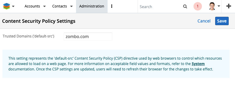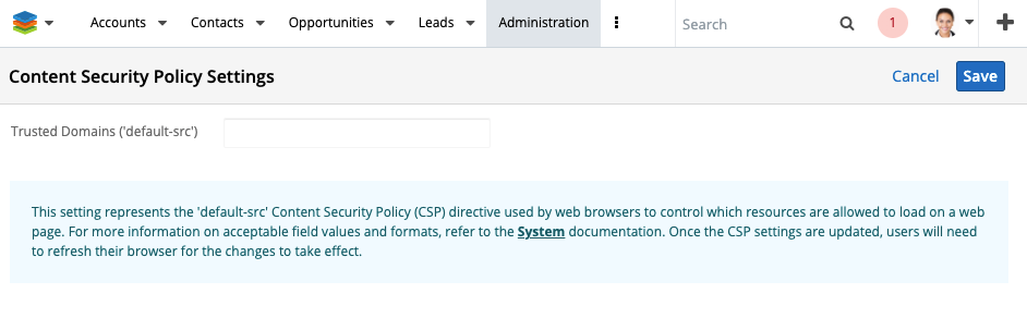 In a previous article, we began talking about upcoming changes to Sugar's enforcement of a Content Security Policy. Well... it's here! In Sugar 11.0, we have introduced the Content Security Policy Admin module. This module will allow administrators to add domains to the CSP whitelist. Currently, the module has a single text field where you can place the value of the default-src CSP directive.