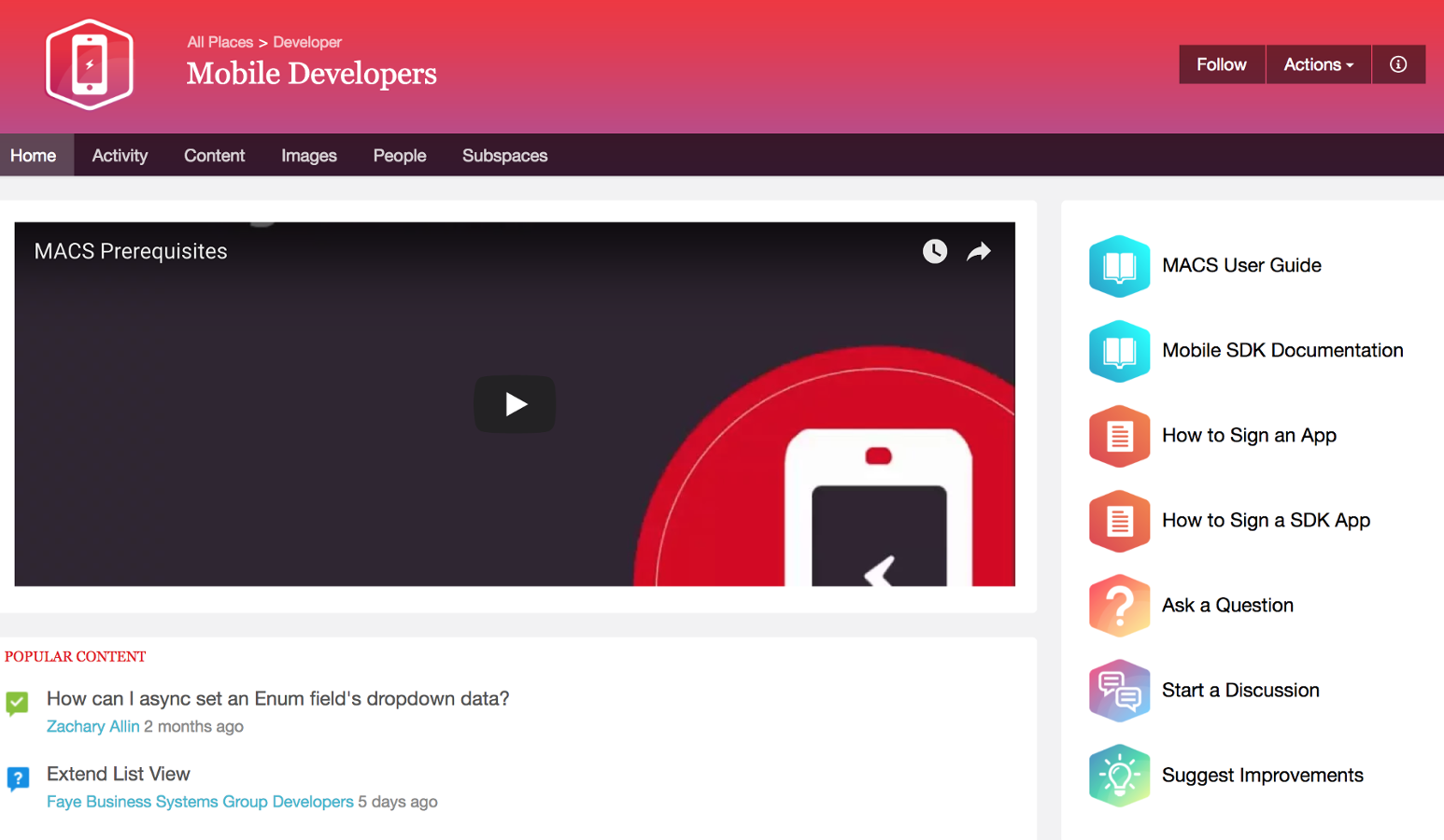 If you want to leverage the Sugar Mobile Application Configuration Service or our Mobile SDK, click Getting Started with Mobile. This subspace has its own documentation as well as a place for you to ask and answer questions. If you’re a mobile developer, you’ll definitely want to follow the Mobile Developers space.