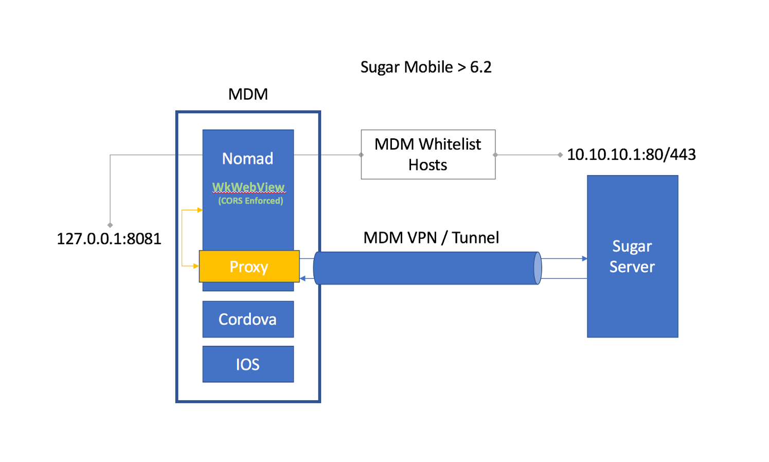 This proxy allows the SugarCRM Mobile app to work around these restrictions and can introduce connectivity issues for some SugarCRM Mobile users. Most users of SugarCRM Mobile are not affected, but if you are using SugarCRM Mobile with Enterprise Mobility Management (EMM) infrastructure (i.e. Airwatch with App Tunneling configuration, or VPN) then you may have already noticed connectivity issues after upgrading to 6.2. For example, some customers have reported an issue with the app hanging on the splash screen.