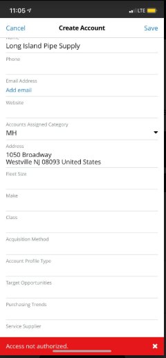 Multiple users with various phone models (iPhone and Android) are encountering an error message "Access not authorized" when attempting to save a newly created account record on the mobile app.