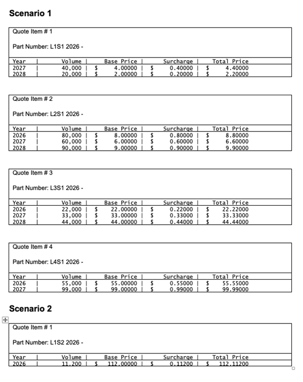 They had a way to define their complex quote with the data for their custom module but they needed a way to translate it to a document they could present to their customers. They had an initial idea for the document which we then developed into a full version. Each scenario would exist as a separate section in the generated document. In each section, every item in that scenario would have its own table. In each of those tables there would be a line for each year showing the pricing being offered for that item in a single year. The following is an example of what we were trying to generated for a document using the previous example data.