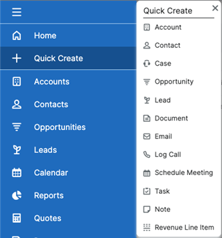 Quick Create view has been redesigned and presents the modules on click. Note this view does not require secondary-action as others with submenu. |