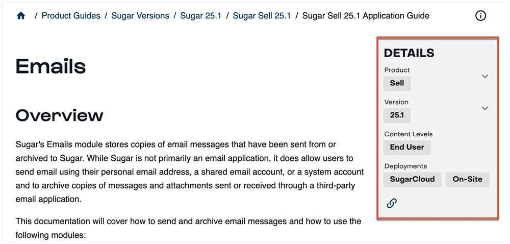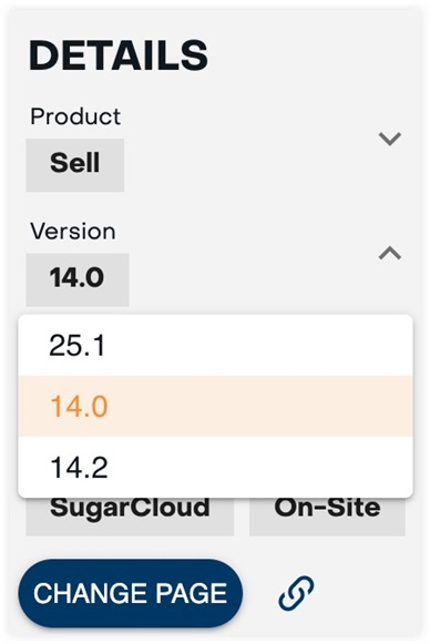 When you land on a Sell, Serve, or Enterprise page in the documentation via search, it may not be quite the page you are looking for. Maybe it's for 14.0 Enterprise when you are using 25.1 Sell. Rather than start your search over or try to edit the URL manually, you should use the switcher in the Details panel available on every page!