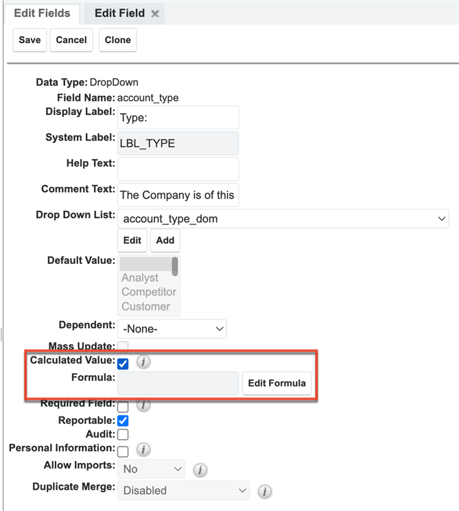 Sugar Q1 2023 (12.3) introduces the ability to designate Dropdown fields as calculated fields in Admin > Studio! Just enable the Calculated Value checkbox for the field and enter your formula. It's as simple as that! As a side note, be sure to double-check your formula to ensure that the dropdown value is a valid option in the dropdown list, as Sugar does not validate the results. So, if the dropdown list has values "A, B, C" and the formula results in a value of "1", then the field will appear blank. |