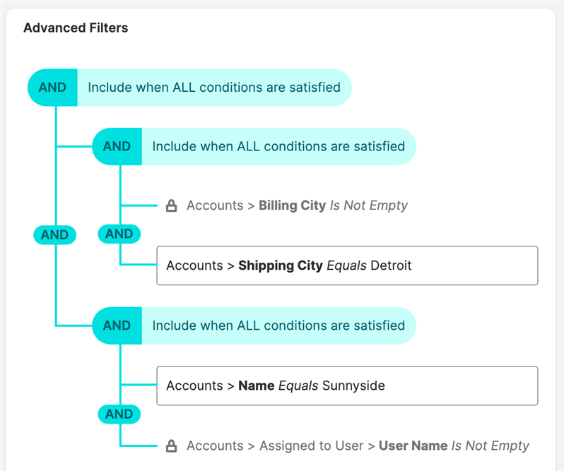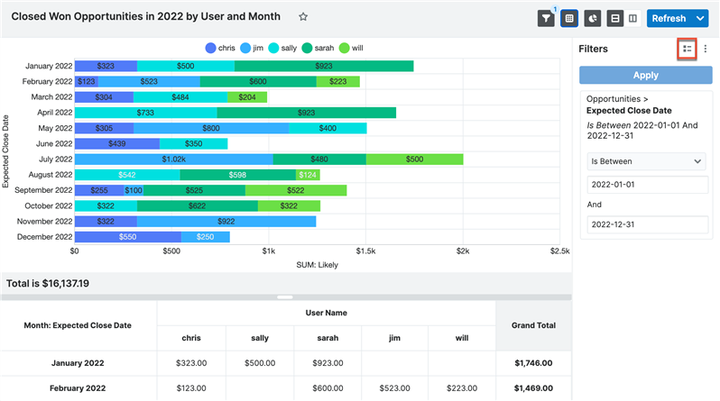 In the refreshed Reports module results view, you can now see a visual representation of all your applied report filters! Simply open the Filters panel and click the Advanced Filters button.