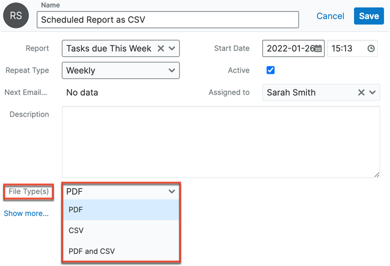 If you have ever scheduled a report to be sent as a PDF and wished there was an option to send it as a CSV instead, you're in luck! Sugar Q1 2022 introduced a new File Type(s) field on the Report Schedules record view so that you can choose whether to send a scheduled report as a PDF, CSV, or both a PDF and CSV.