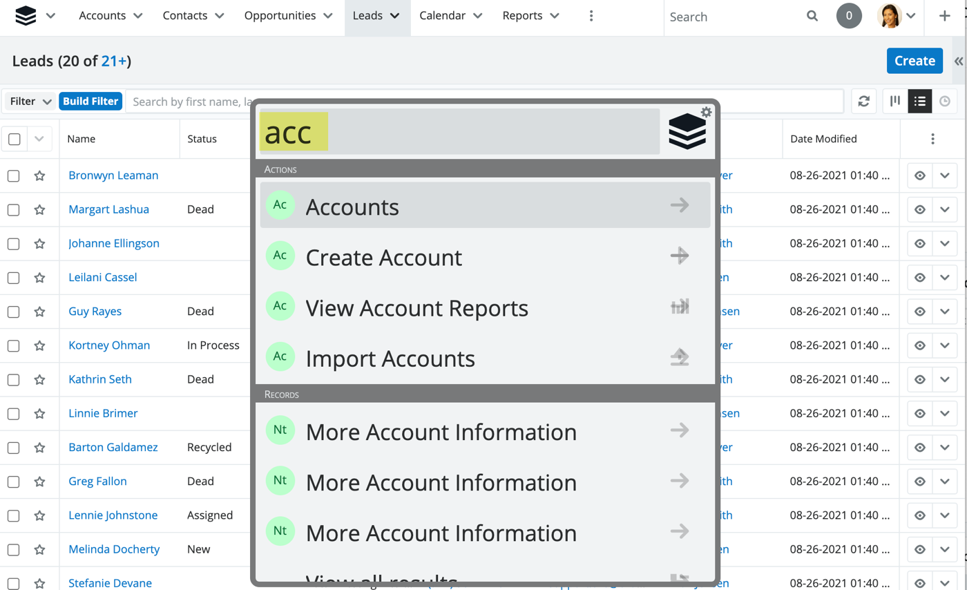 Let's revisit a great tip from a couple of years ago -- Sugar's Sweet Spot search. Sugar's Sweet Spot allows you to search for just about anything in Sugar, from modules to records to module action menu items! You can even configure shortcut hotkeys to make routine searching even easier.