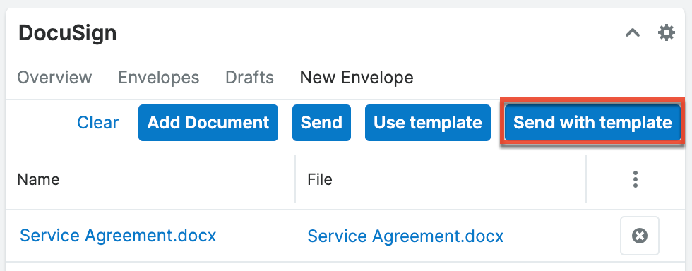 - You can use a template document, such as a Non-Disclosure Agreement, that you send to every customer. Click the "Use template" button in the DocuSign dashlet to select this document and have the document and fields ready to go.