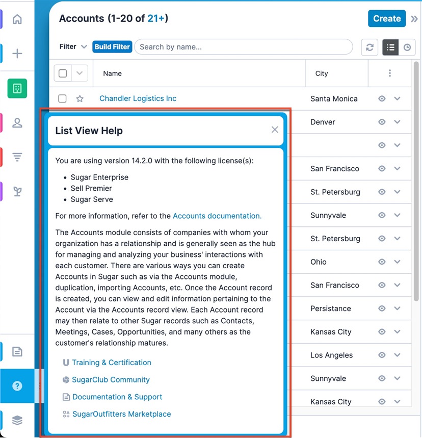 The Help icon at the bottom of the navigation bar of Sugar contains several useful links, but what you may not know is that it also has a contextual documentation link for many pages in Sugar. If you are in the Accounts module, the link takes you to the Accounts documentation. If you are viewing a report, the link takes you to the Reports documentation. Not only that, it opens the content specific to the product and version (e.g., Sell 14.2, Enterprise 14.0) that you are using, so you know you're reading exactly the right thing.