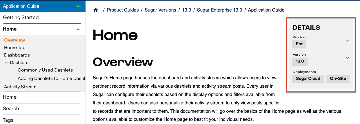 At the top right corner of every Sugar Sell, Serve, and Enterprise page, the Details panel makes it obvious which guide you are currently viewing. Is this Sell version 13.1 or Enterprise version 12.0? We know this has always been a source of confusion because it is hard to know which guide you are in, and the Details panel should be a big help.