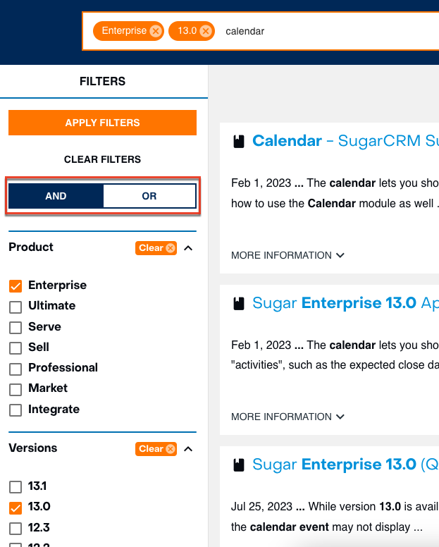 We are actively working on further improving the filter options, so they won't be displayed with the new Google-based search yet, but a new feature will be coming soon to filtering - "AND" and "OR" operators. This will give you even more control in how you filter the returned results to ensure that you are only seeing content for your Sugar version or product. Stay tuned for that!
