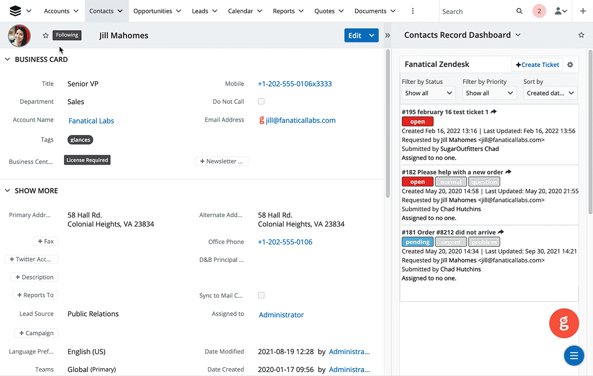 - From any account, contact, or lead view in Sugar, enter a name or email address in the Glances search bar