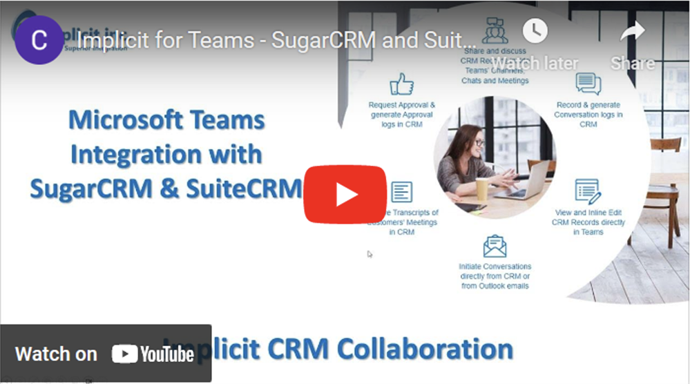 Microsoft Teams is a phenomenal collaboration platform for business users to present, review and discuss various types of content. Implicit's deep integration with Microsoft Teams turns it into an efficient and productive CRM collaboration platform. It enables your sales, marketing, and support teams to discuss CRM topics, gather information from colleagues in real-time, exchange ideas and receive feedback. Using Teams as a collaboration platform to share and discuss CRM records, will speed up your sales process and boost your team’s productivity. Furthermore, it allows you to keep records of important conversations, approvals, and transcripts of customers’ meetings in SugarCRM.