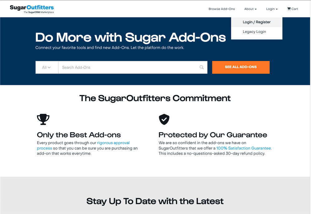 - All users must register thru the SugarCRM Portal in order to make Add-On purchases or submit new Add-Ons to the SugarOutfitters marketplace.