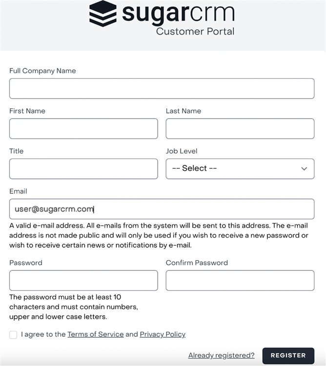 1. If you do not have an existing SugarCRM Portal account, register with the SugarCRM Portal. When you register, make sure you use the same e-mail address that you use with SugarOutfitters.