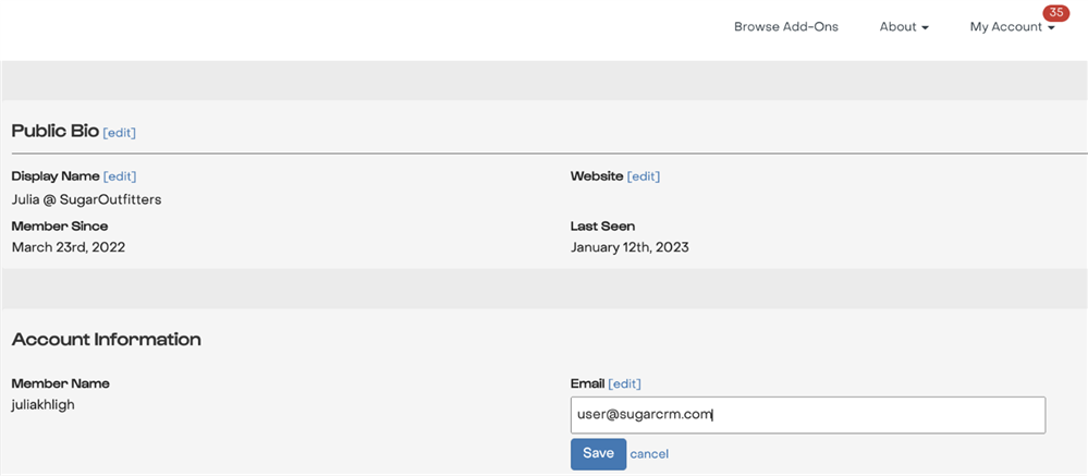 2. If you have an existing SugarCRM Portal account, make sure that the SugarOutfitters account e-mail address matches the one you use on your SugarCRM Portal account. If this is not set correctly then you will not be able to access your Outfitters account using your Portal login. This is the link between your Outfitters account and your SugarCRM Portal account.