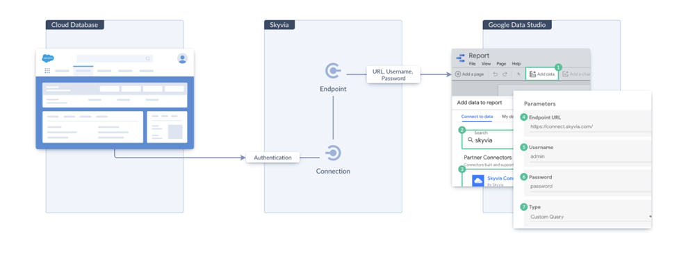Step 2. Connect Looker Studio to Skyvia. Within Looker Studio, establish a connection to Skyvia using the Skyvia connector for data sources. Provide the necessary connection details, including the Skyvia endpoint and authentication credentials.