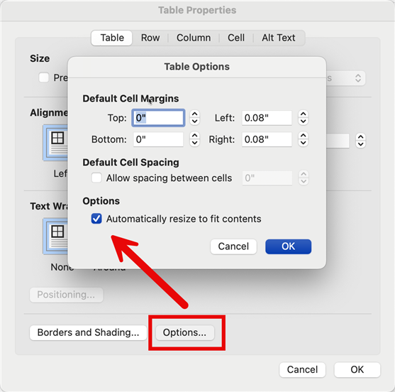 • Go to the Options tab and make sure you check the box for 'Automatically resize to fit contents'. This will allow Word to adjust the cell sizes automatically based on the content (in this case, images) that gets inserted during the merge process.