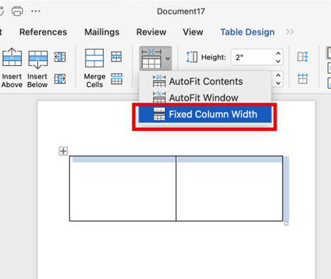 Table Layout > AutoFit > Fixed Column Width