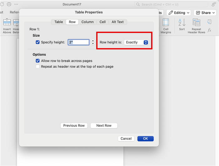 Table Properties > Row > Set Height to “Exactly”