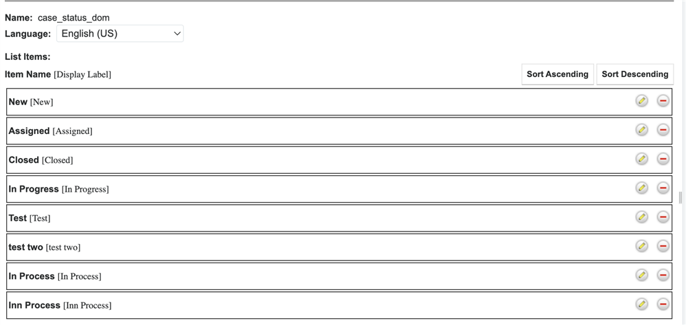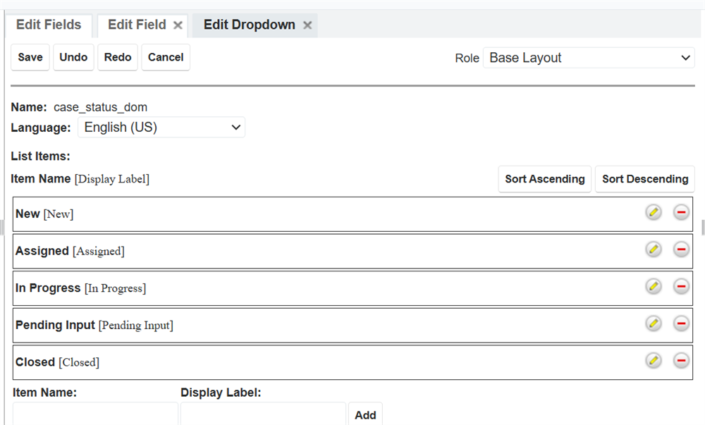 Go to Dropdown Editor and modify the case_status_dom as follows: