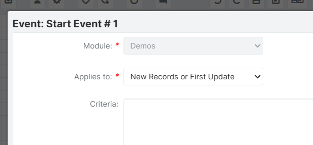 I'm running sugar enterprise 14.0.3 on-site.  The Target Module on my BPM process is Demos, and I can add the criteria on the start settings.  I just can't get the action type to work.