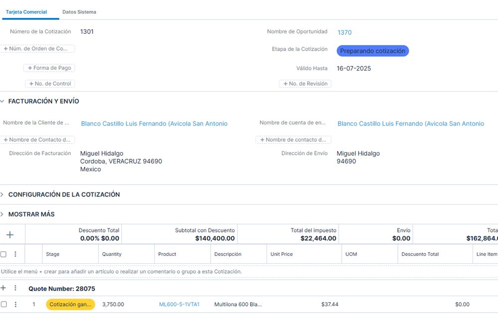 un ejemplo que se puede observar antes que cambie la etapa de la cotización a ganada