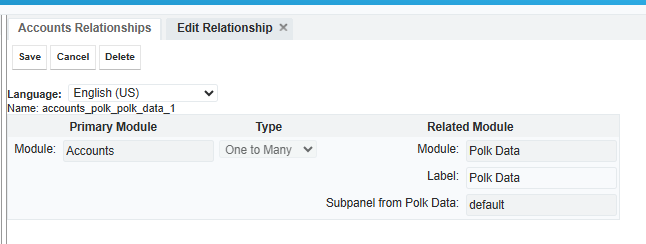 I created a custom module within my sandbox -- i added a relationship Accounts 1 to Many to Polk Module (new custom module).  Subpanel from Polk Data is default only - no other options