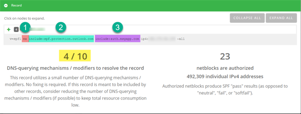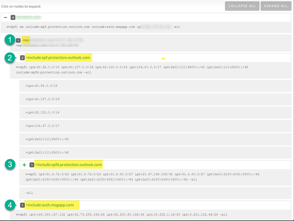 So this customer is still within the limit of 10. However, if you notice, Dmarcian actually says it counts 4 out of the 10 limit. This is because within those mechanisms, there is a nested DNS lookup, which also counts. So if we expand, we can see the nested DNS lookup that was nested within the 'Include: spf.protection.outlook.com: