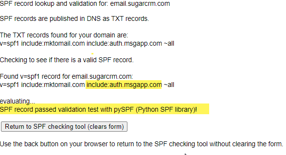 - Verify the include:auth.msgapp.com parameter is within their SPF record and that you receive the following message: