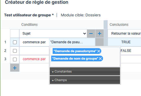 Row 2: subject starts with "Demande de nom de groupe" = return 'TRUE' value