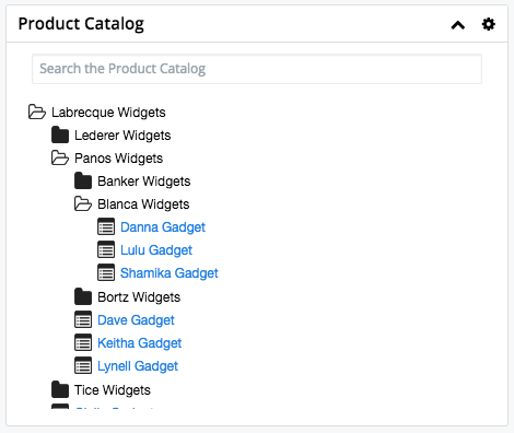 Product categories are represented as folders and are organized to reflect the structure of the customer's category hierarchy. Users can click on individual folders to reveal the products contained in each category. Clicking the product name will immediately add the product to the quote displayed on the page. Clicking on the icon next to a product will open the full product catalog record in a drawer. Users may add the product to their quote directly from the drawer or close the drawer without adding the product and return to their quote.